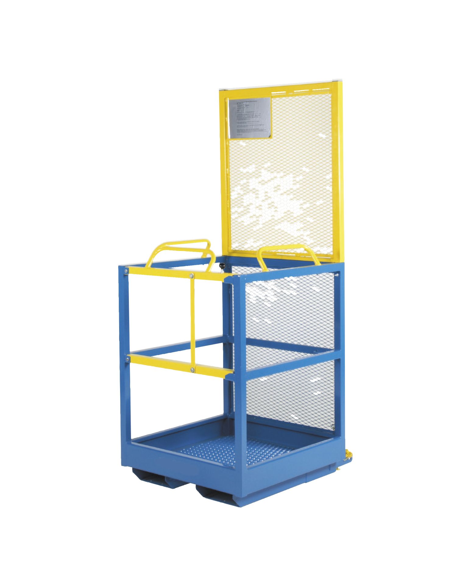 Turvalliseen henkilönostoon suunniteltu kori, jossa on liukumista vähentävä lattiapinta ja tuplalukituskiinnitys haarukkatrukkiin. Jousitettu salpalukitus ja sormisuojat edessä ja sivuilla.