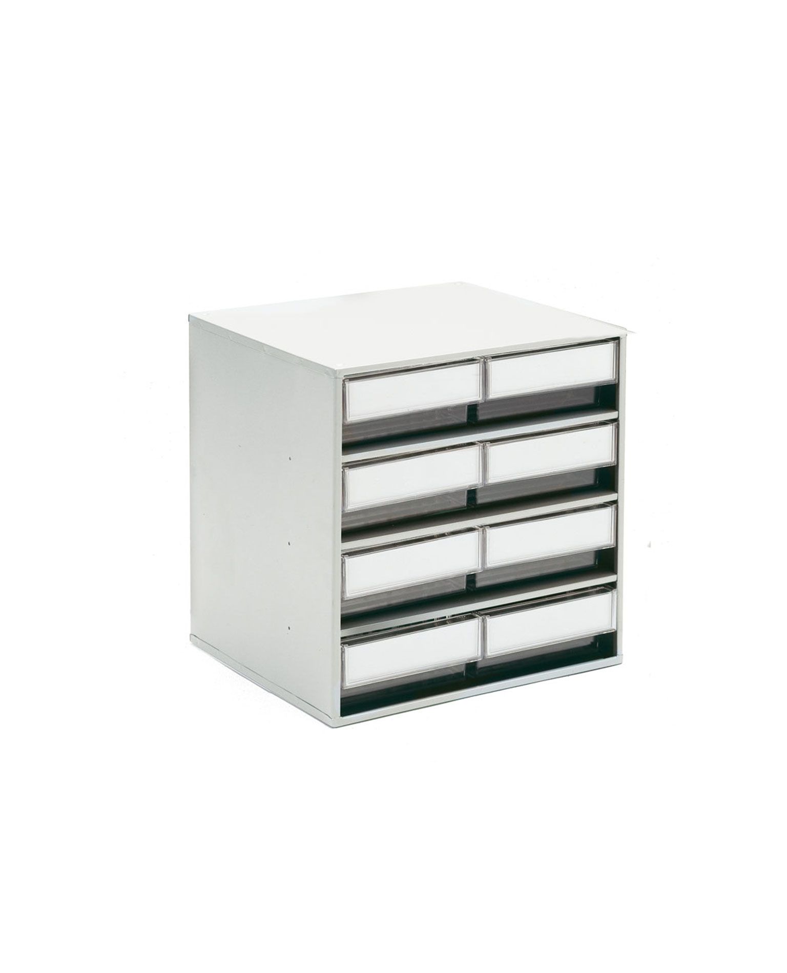 Saatavilla kaksi syvyyttä, 300 ja 400 mm. Kirkkaat laatikot ovat polystyreeniä (PS). Siniset, punaiset ja harmaat laatikot polypropeenia (PP), poikkeuksena mallin 4040 laatikot, jotka ovat värillistä polystyreeniä (HIPS). Lisätarvikkeena poikittaiset välilevyt ja pyörivät telineet.Raaka-aine värillisissä laatikoissa polypropeenia (PP), lämmönkesto -20 x +75°C. Kestää öljyjä, useimpia happoja ja alkaleja sekä liuottimia. Lasinkirkkaissa raaka-aine polystyreeniä (PS), lämmönkesto -40 x +55°C.