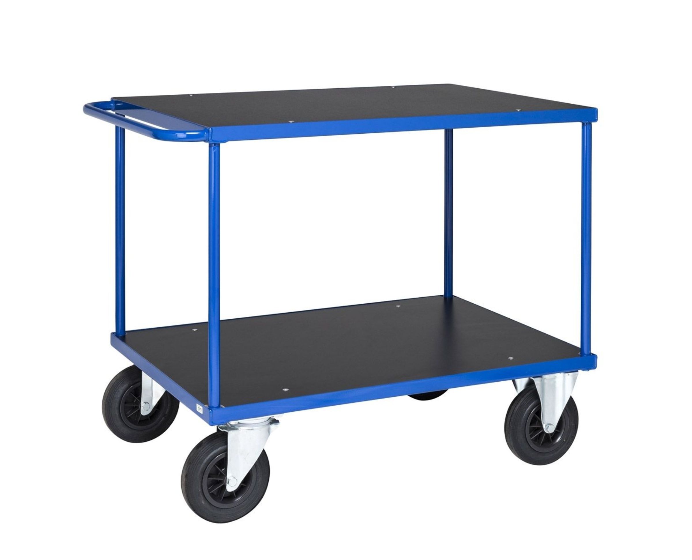 Kahden tason hyllyvaunu 500 kg kantavuudella tarjoaa erinomaisen ratkaisun logistiikan ja varastoinnin ammattilaisille. Runko on valmistettu kestävästä ja vahvasta jauhemaalatusta teräksestä, mikä tekee vaunusta erityisen kestävän kovassakin kulutuksessa. Monikäyttöinen vaunu, jossa toisessa päässä työntöpääty.
