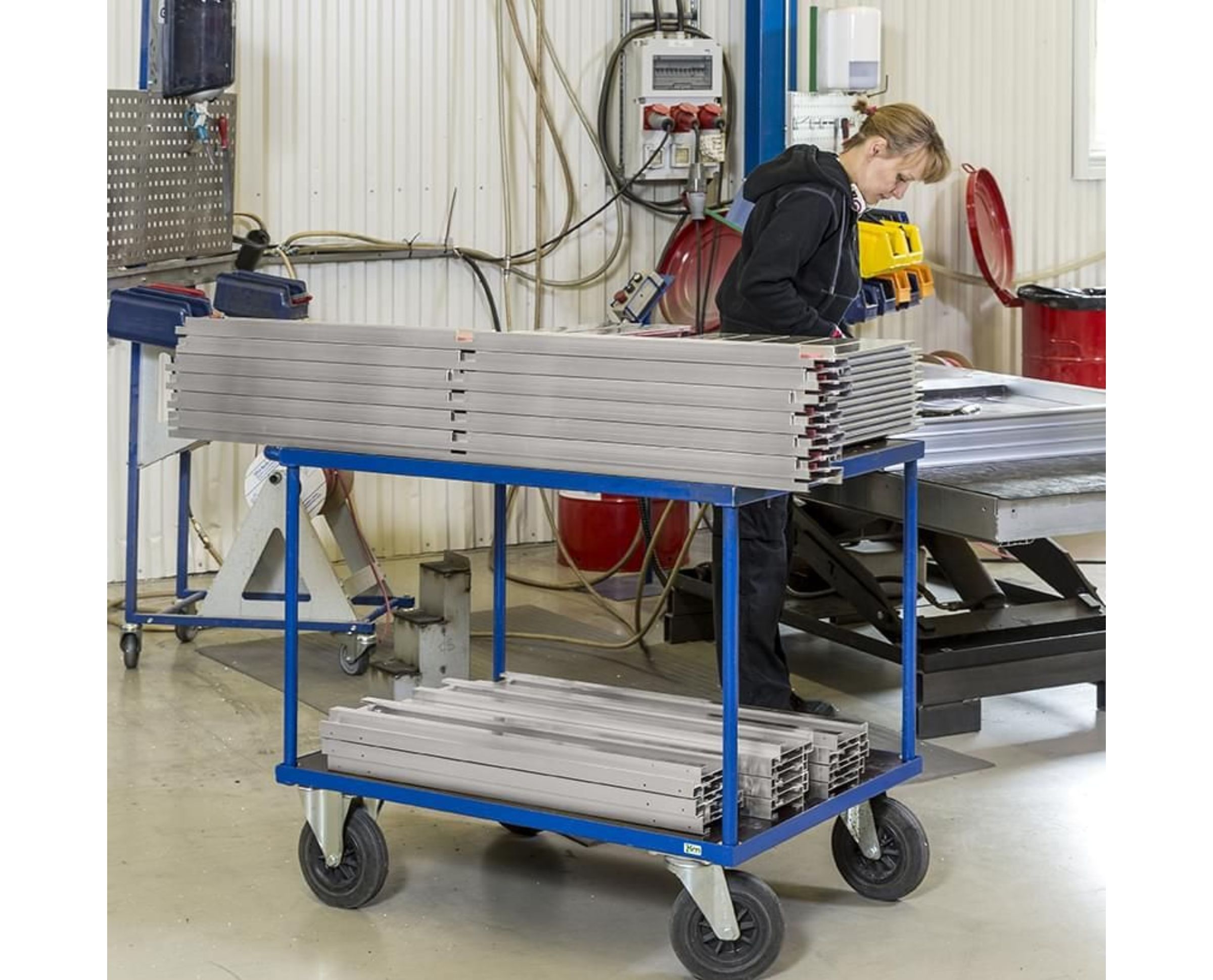 Kahden tason lavavaunu 500 kg kantavuudella tarjoaa erinomaisen ratkaisun logistiikan ja varastoinnin ammattilaisille. Runko on valmistettu kestävästä ja vahvasta jauhemaalatusta teräksestä, mikä tekee vaunusta erityisen kestävän kovassakin kulutuksessa. Monikäyttöinen vaunu, jossa toisessa päässä työntöpääty.