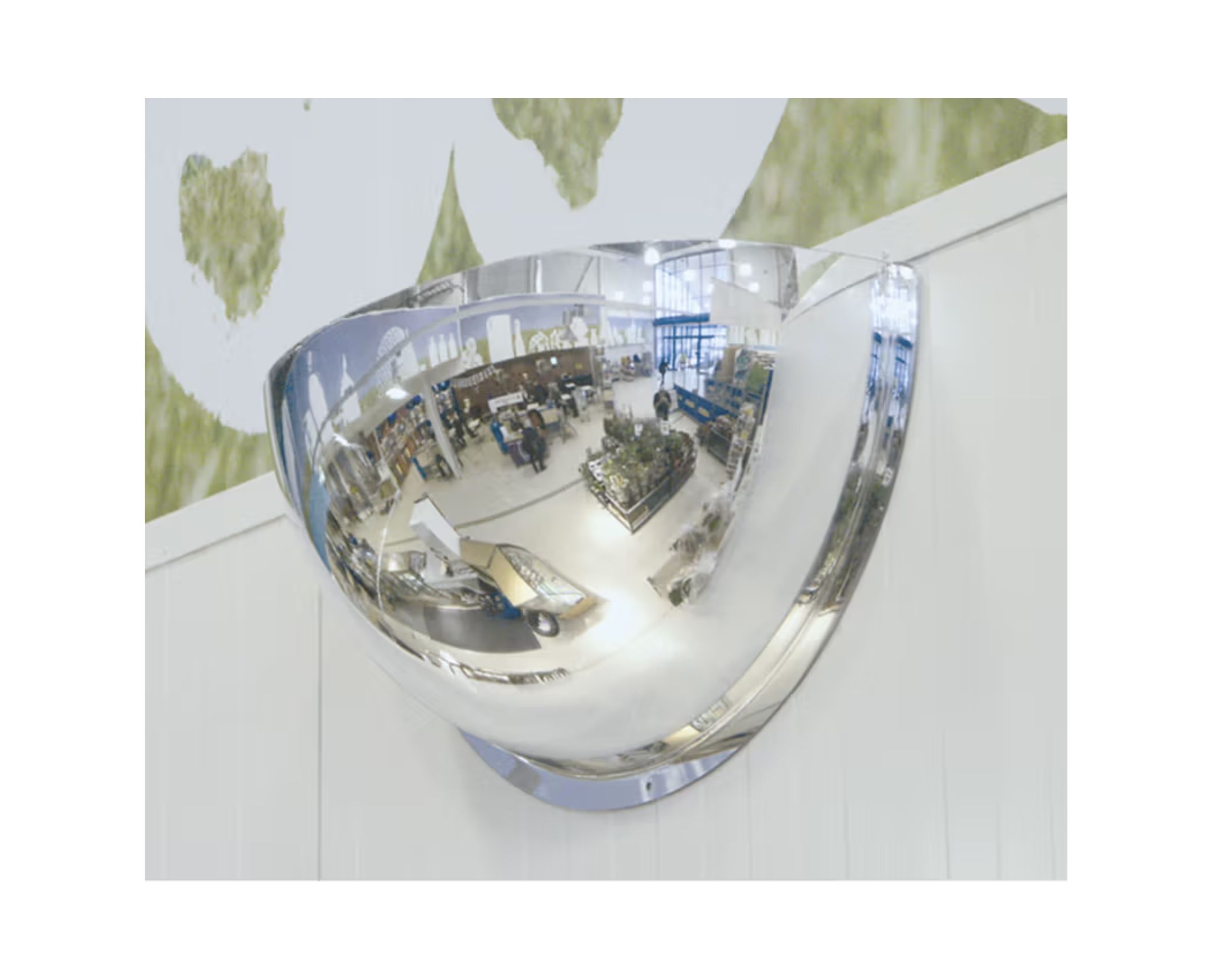 Kestävä kupolipeili, jossa 180 asteen näkökenttä. Sopii hyvin varastoihin ja myymälöihin. Valvonta-alue 600 mm peilissä 1-15 m2, 800 mm peilissä 15-20 m2 ja 1000 mm 20-30 m2.