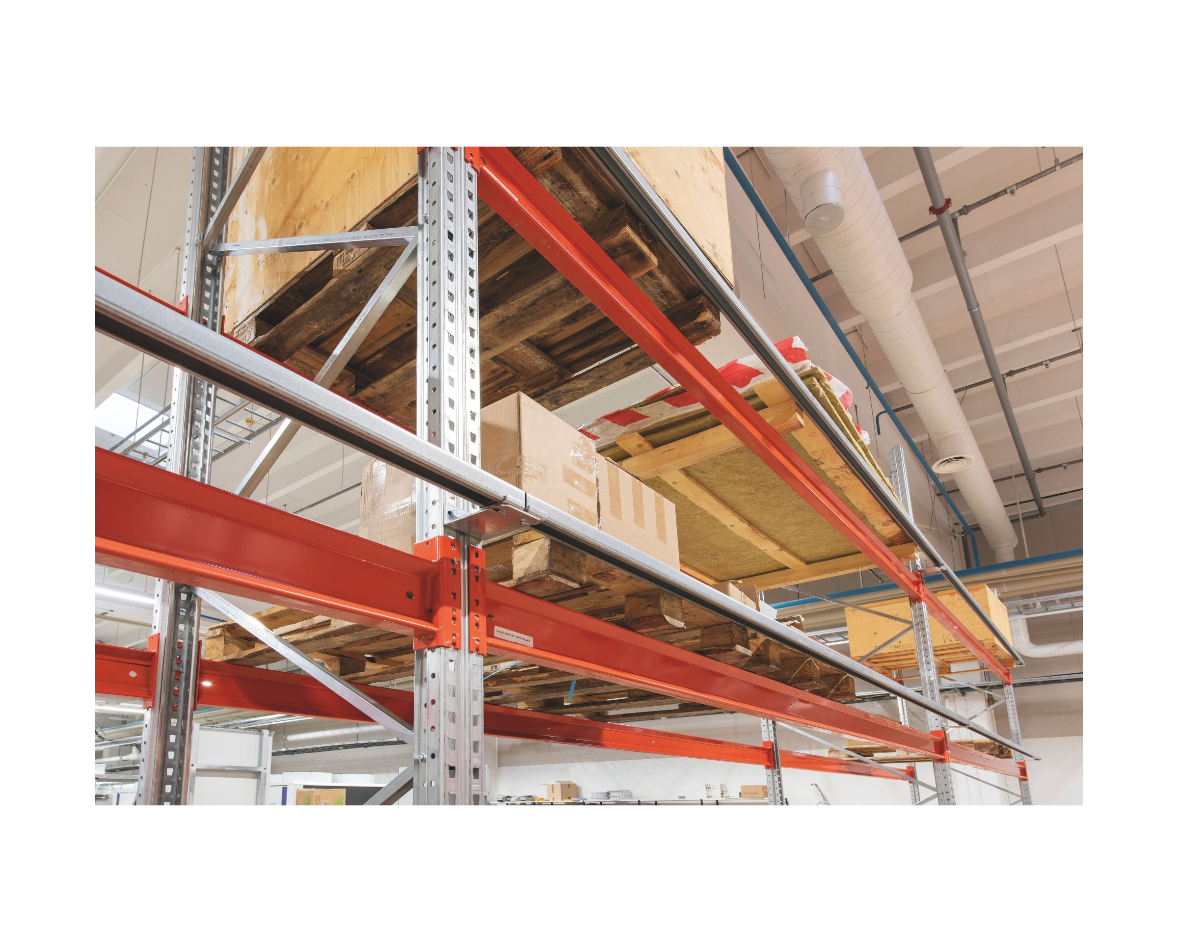 Vaakamallinen lavarajoitin, leveys 2835 mm.Takarajoitinputkella estetään kuormalavan meneminen liian syvälle hyllyyn. Rajoitinputkia on vaaka- ja pystymalleja.