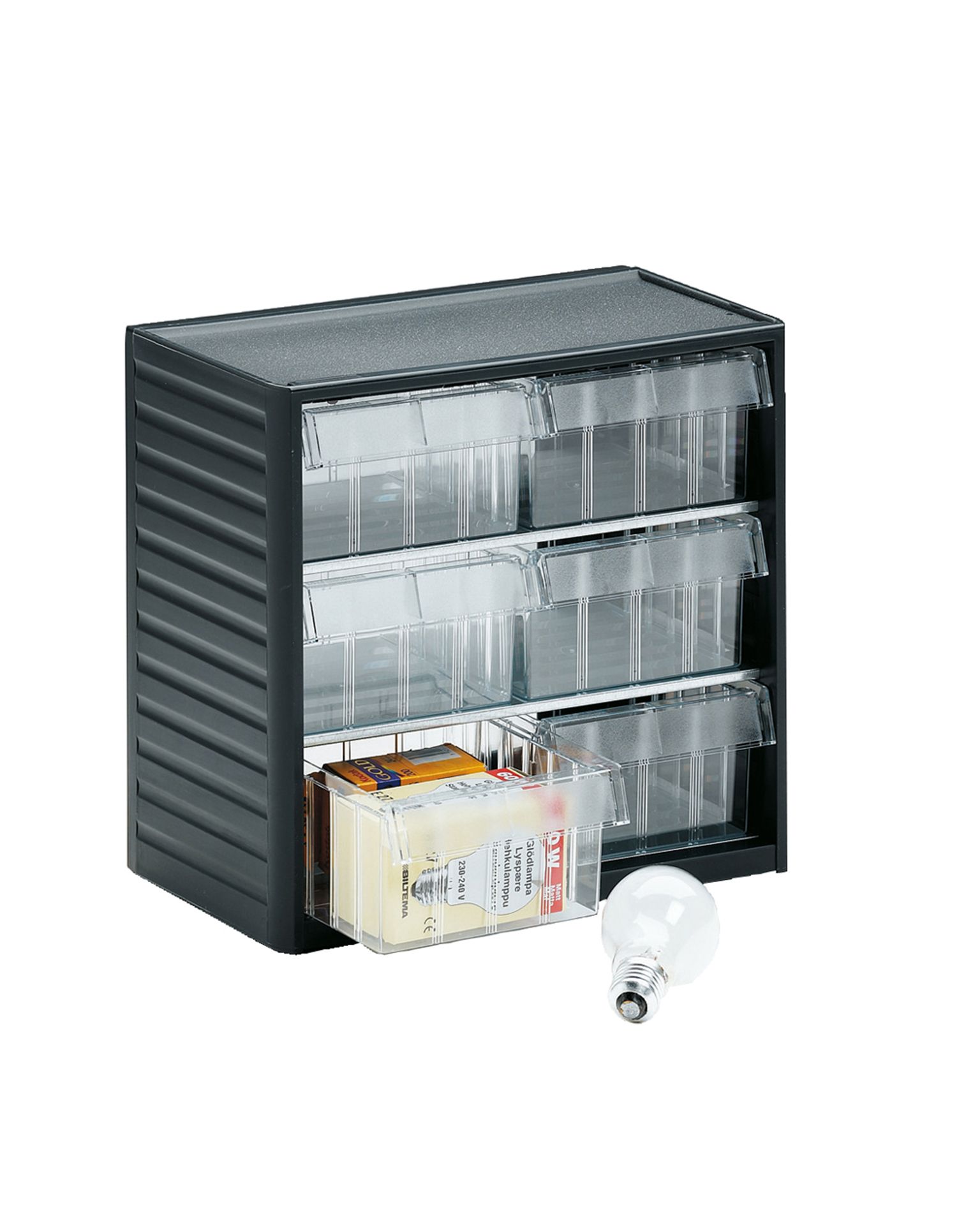 Laadukkaat kotimaiset pientavaralaatikostot ammattikäyttöön. Laatikostoja voi pitää pöydän päällä, kiinnittää ruuveilla seinälle, pinota pyöriviin telineisiin tai laatikostotelineisiin. Kehikko on muotoiltua polypropeenia, hyllyt sinkittyä teräslevyä, laatikot lasinkirkasta polystyreeniä. Sarjassa on seitsemän erilaista laatikostoa.