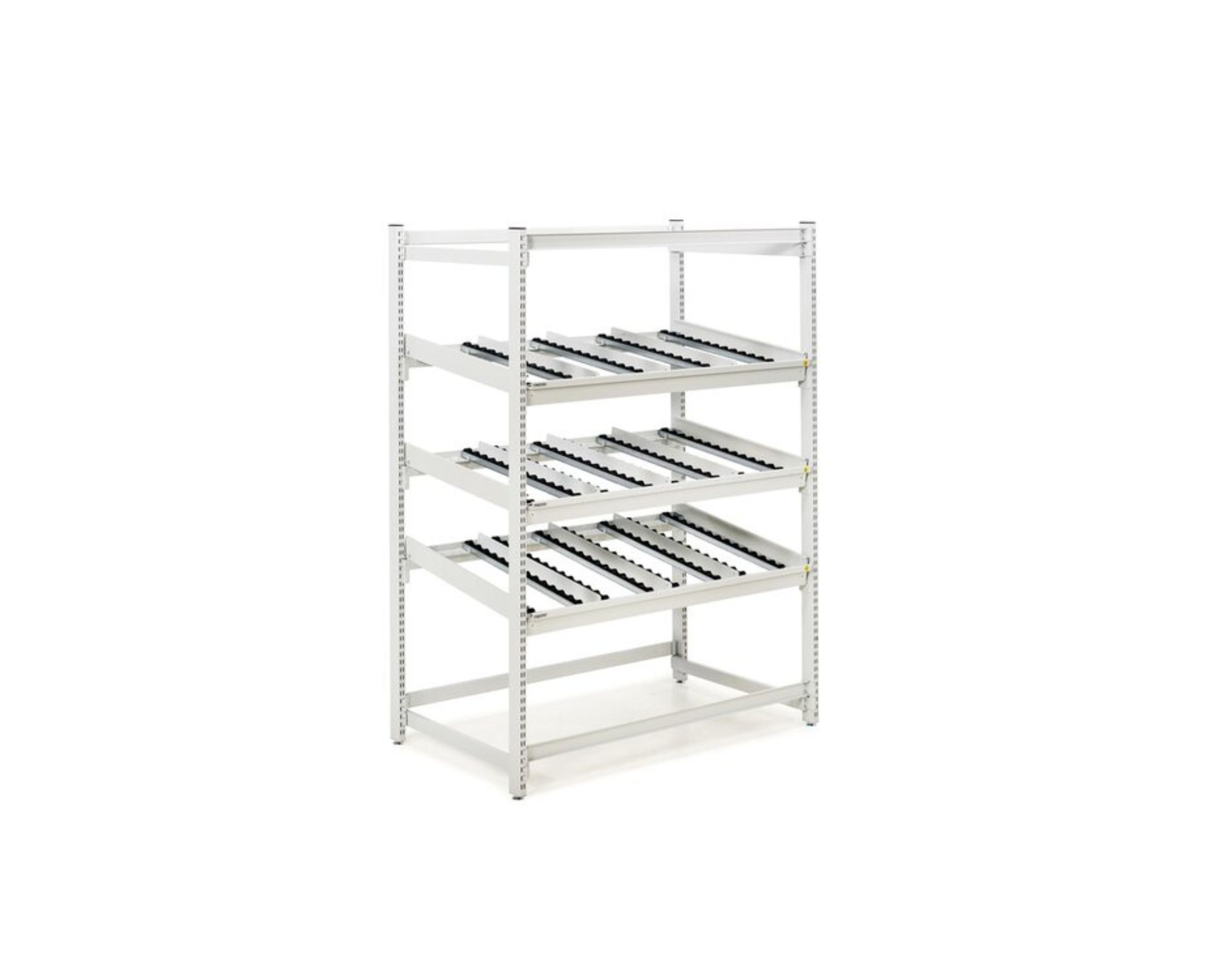 Läpivirtaushylly tehokkaaseen varastoitiin. Hylly sisältää 3 rullakkotasoa, jotka ovat säädettävissä ilman työkaluja.