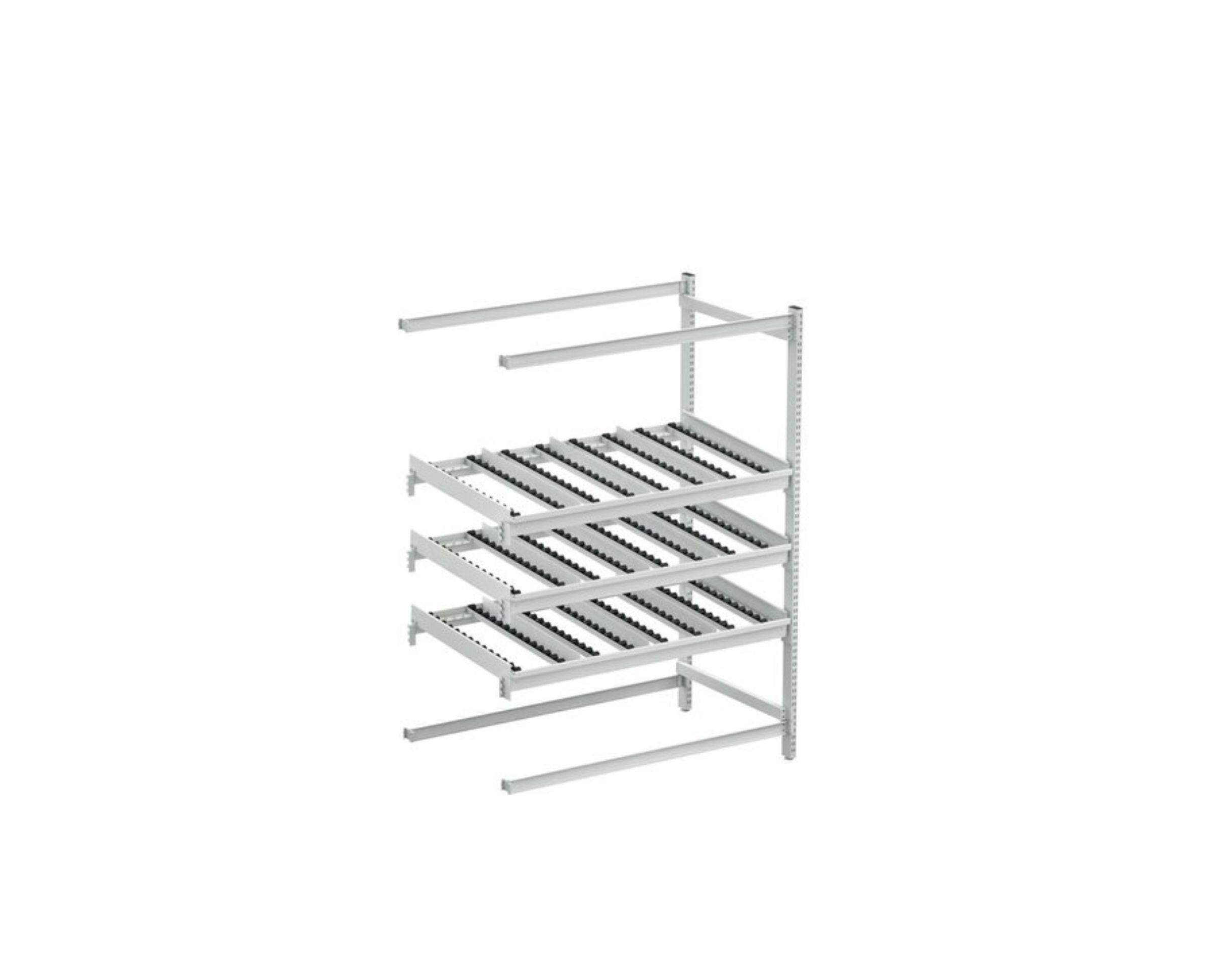 Läpivirtaushyllyn sivujatkeella lisäät helposti varastotilaa äärettömästi. Hylly sisältää 3 rullakkotasoa, jotka ovat säädettävissä ilman työkaluja.