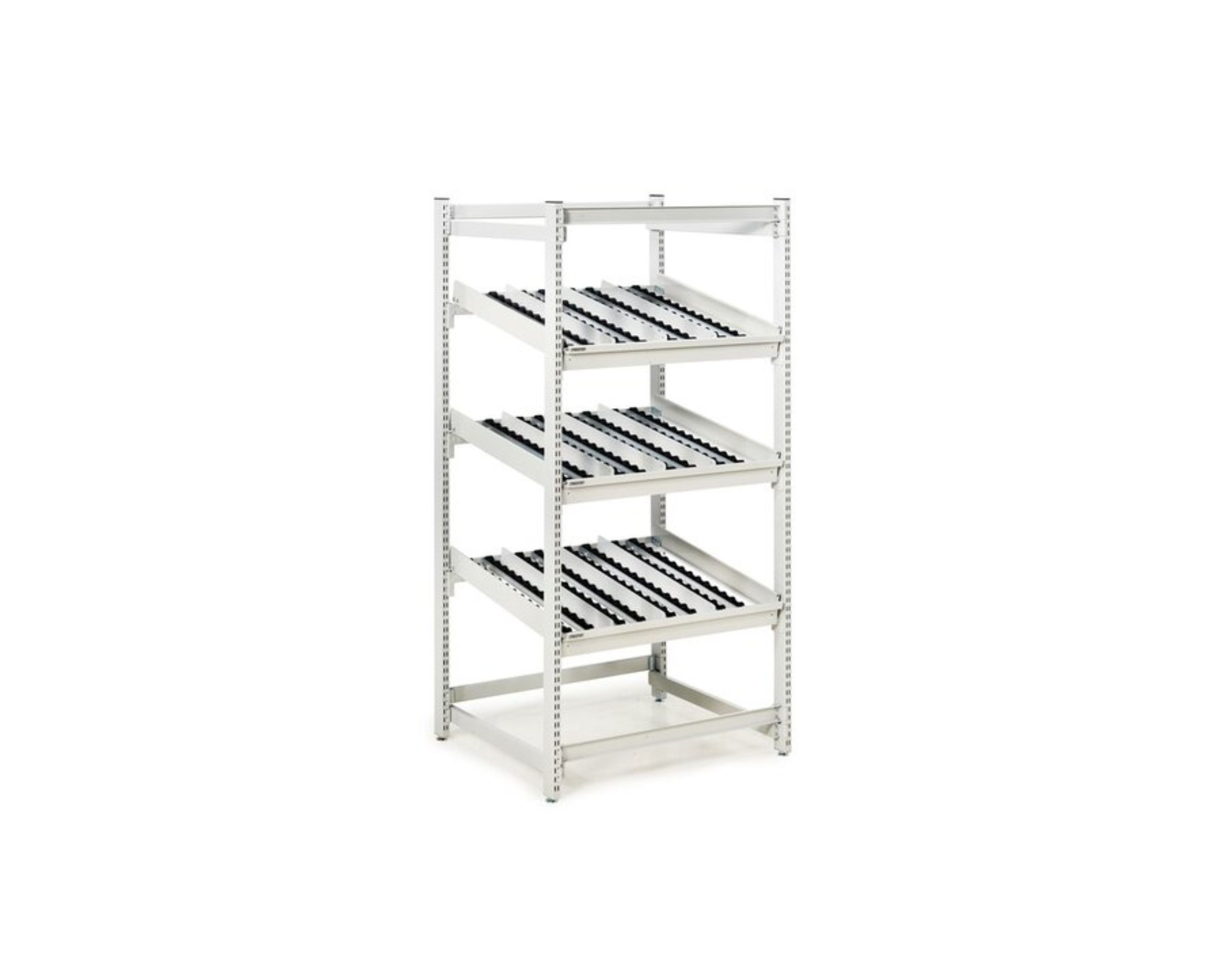 Läpivirtaushylly tehokkaaseen varastoitiin. Hylly sisältää 3 rullakkotasoa, jotka ovat säädettävissä ilman työkaluja.