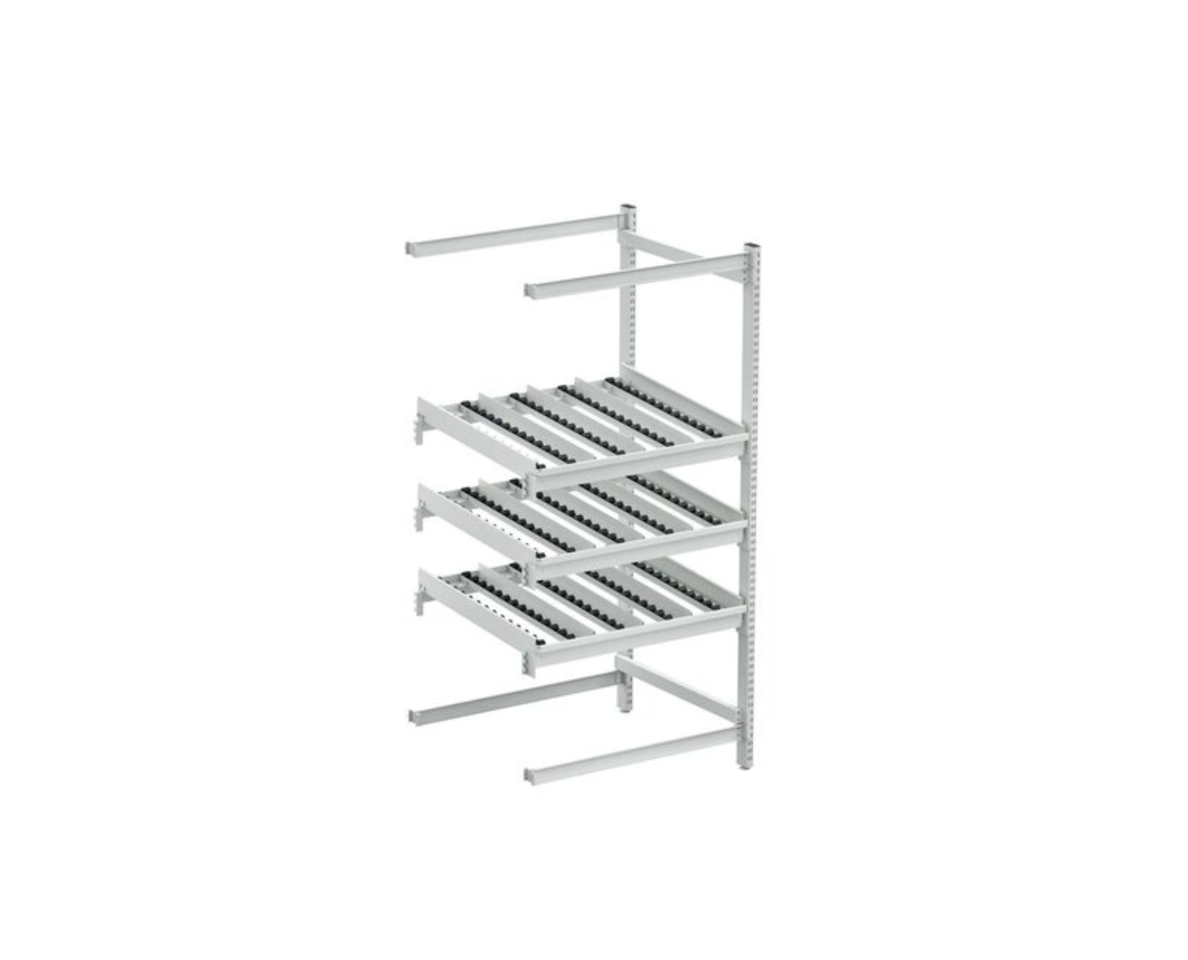 Läpivirtaushyllyn sivujatkeella lisäät helposti varastotilaa äärettömästi. Hylly sisältää 3 rullakkotasoa, jotka ovat ilman työkaluja säädettävissä.