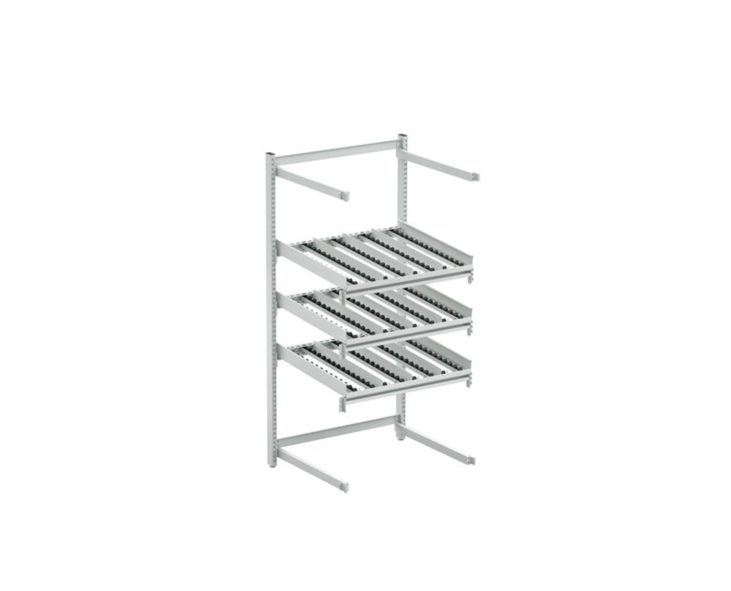 Läpivirtaushyllyn takajatkeella tuplaat helposti varastotilan. Sisältää 3 rullakkotasoa, jotka ovat säädettävissä ilman työkaluja.